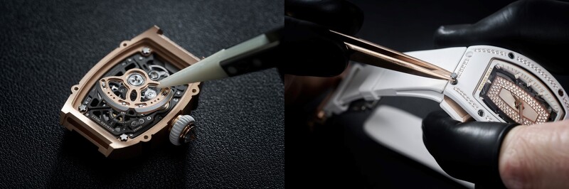 融入各种顶级工艺,并做到精密、轻量的RICHARD MILLE,佩戴时相当舒适、符合人体工学的独特錶壳,不仅製作极为费工耗时,是瑞士製錶业中最难生产的錶壳之一。对腕錶来说不可或缺的錶带和錶鍊,RICHARD MILLE同样极尽用心!像是以时尚金属鍊环组成的Open Link鍊环式錶鍊,製程中必须以纯手工做到细腻的微喷砂、抛光和缎面处理,方能让錶鍊佩戴时舒适服贴手腕且完美强韧,让珍贵的RICHARD MILLE腕錶能陪伴佩戴者,随时随地自信活跃前行。